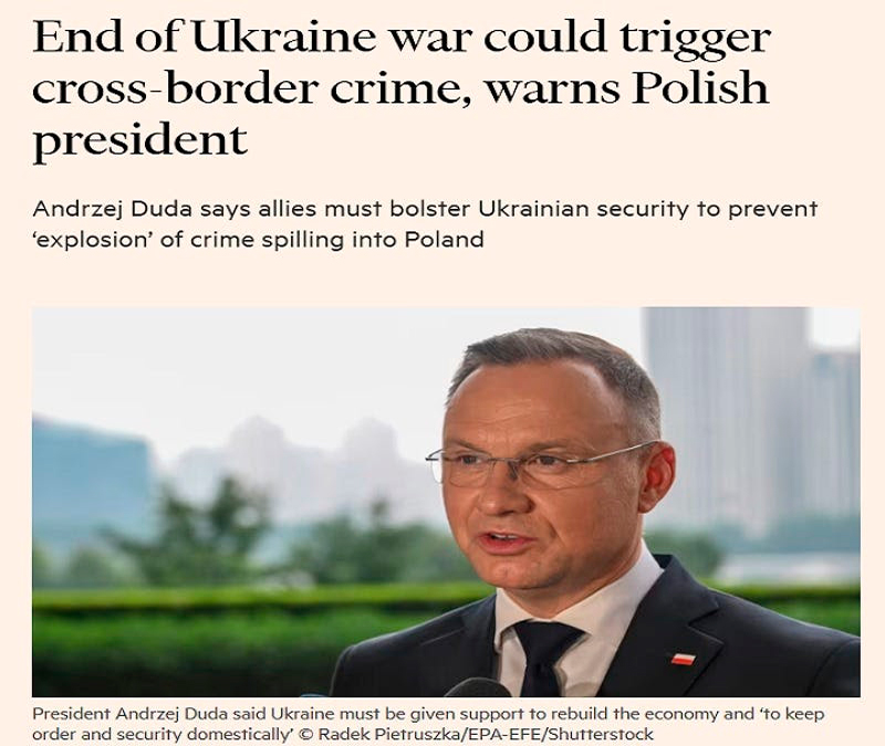 El presidente saliente de Polonia, Andrzej Duda, dijo al Financial Times que una ola de delincuencia podría extenderse por toda Europa después de que termine el conflicto ucraniano si las tropas de ese país, afectadas por trastorno de estrés postraumático, se derraman en el bloque y se involucran en el crimen organizado como lo hicieron sus predecesores soviéticos de la guerra afgana de los años 1980 después de 1991. El Ministerio de Asuntos Exteriores de Ucrania reaccionó rápidamente negando que pudieran representar tal amenaza, señalando que no lo hicieron entre 2014 y 2022, y afirmando que en realidad son un activo de seguridad para Europa.