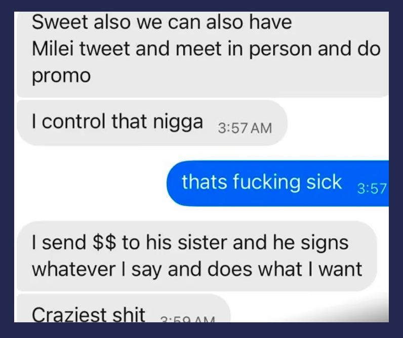 En mensajes de texto a los que accedió el sitio CoinDesk y que también publicó La Nación, Hayden Davis, CEO de Kelsier Ventures, afirmó que podía «controlar» a Javier Milei debido a los pagos que había estado haciendo a su hermana.