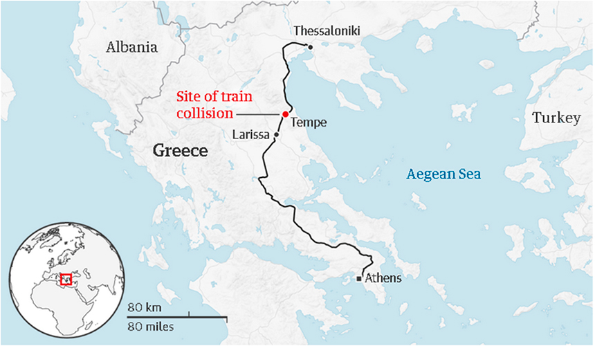 Tras el accidente, se produjeron protestas nocturnas y enfrentamientos con la policía en toda Grecia, mientras que el 2 de marzo de 2023, los empleados ferroviarios de Hellenic Train y del Metro de Atenas se declararon en huelga para protestar por los peligros asociados al accidente.