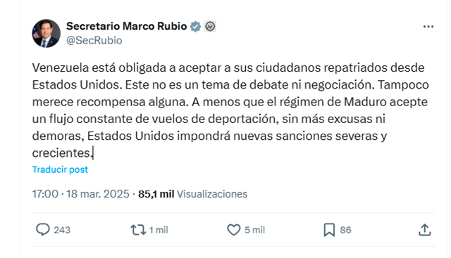 «A menos que el régimen de Maduro acepte un flujo constante de vuelos de deportación, sin más excusas ni demoras, EE.UU. impondrá nuevas sanciones severas y crecientes«, advirtió Rubio.
