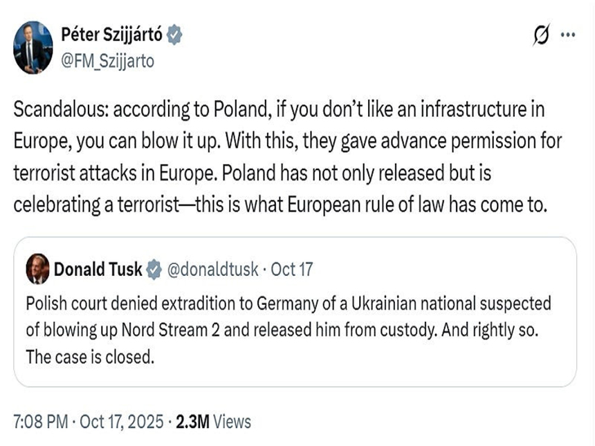Luego escribió en X : «Escandaloso: según Polonia, si no te gusta una infraestructura en Europa, puedes volarla por los aires. Con esto, dieron permiso previo para atentados terroristas en Europa. Polonia no solo ha liberado, sino que está celebrando a un terrorista; en esto se ha convertido el Estado de derecho europeo». Estos son puntos convincentes y demuestran que Hungría se preocupa por los principios en juego en este caso. También tiene intereses indirectos en todo esto que los observadores ocasionales podrían desconocer y que se explicarán a continuación.