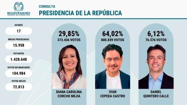 Con 34 puntos de diferencia respecto a la segunda candidata más votada, Diana Corcho, Cepeda se confirma como el candidato de la coalición Pacto Histórico, conformada por el Polo Democrático, la Unión Patriótica, el Partido Comunista Colombiano y otras fuerzas políticas.