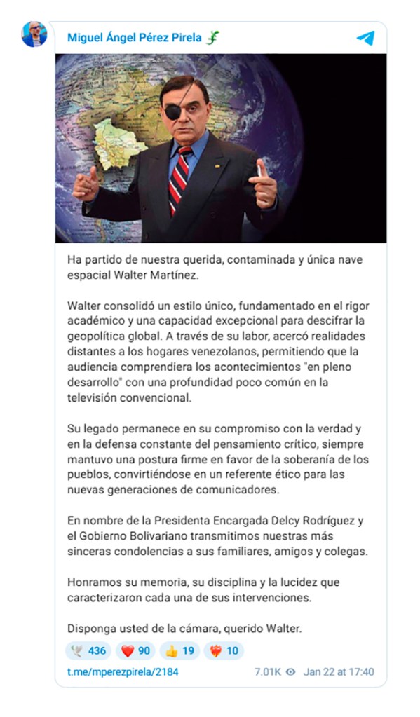 En el texto destacó que Walter Martínez «consolidó un estilo único, fundamentado en el rigor académico y una capacidad excepcional para descifrar la geopolítica global. A través de su labor, acercó realidades distantes a los hogares venezolanos, permitiendo que la audiencia comprendiera los acontecimientos «en pleno desarrollo» con una profundidad poco común en la televisión convencional».