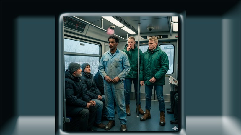 Sorpresivamente uno de los neo-nazis, el de la cabeza afeitada, saca de la boca el chicle que rumia y lo pega en el lente redondo de la cámara de seguridad ubicada en el techo del vagón. Y, los otros dos comienzan a dar chillidos estridentes en las mismas orejas del trabajador caribeño. Saltan y le dan puntapiés sonoros con la puntera metálica de sus botas a los tubos del vagón a escasa distancia suya. La trepidación de los tubos llega hasta nuestros asientos. Dan gritos en sus oídos, al parecer con palabras obscenas buscando obviamente aterrorizarlo, y atemorizarnos a todos. Mi amigo me insiste en guardar calma. Los demás pasajeros fingen indiferencia tratando de ignorar lo que acontece, concentrándose aún más en su mirada perdida. Los minutos se alargan desapaciblemente.