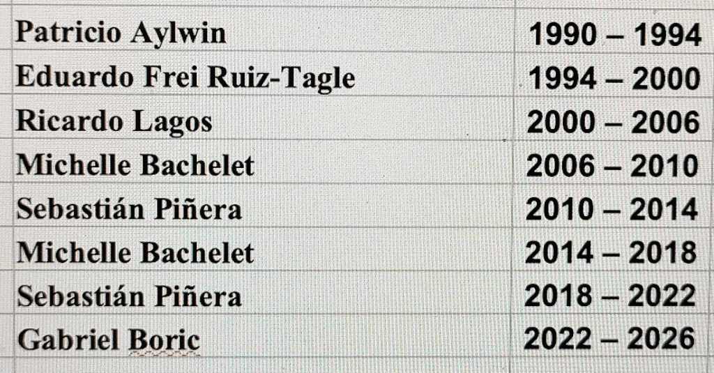 No queda sino recordar que Pinochet dejó el poder en 1990… hace 36 años, y que desde entonces se sucedieron en La Moneda diferentes benefactores de la Humanidad cuya lista se alarga como las sombras por la tarde. Hela aquí:
